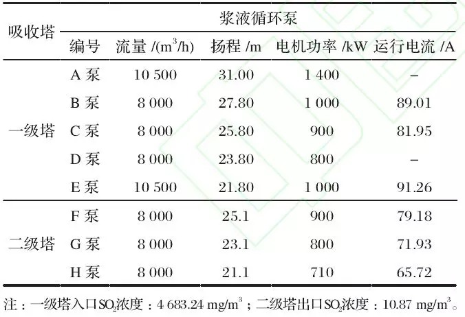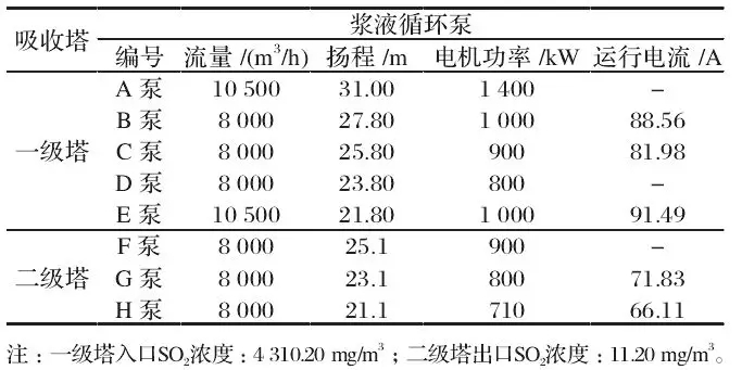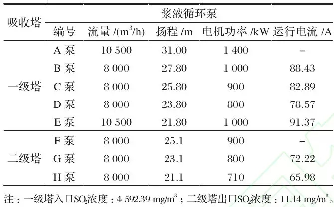 塔脫硫系統由原“1爐1塔”改為“一爐雙塔”,即在一級塔后新增二級塔,同時,配套3臺脫硫漿液循環泵和2臺氧化風機等,封堵旁路煙道。串聯塔共設3A~3H漿液循環泵8臺,其主要能耗參數如表1所示。