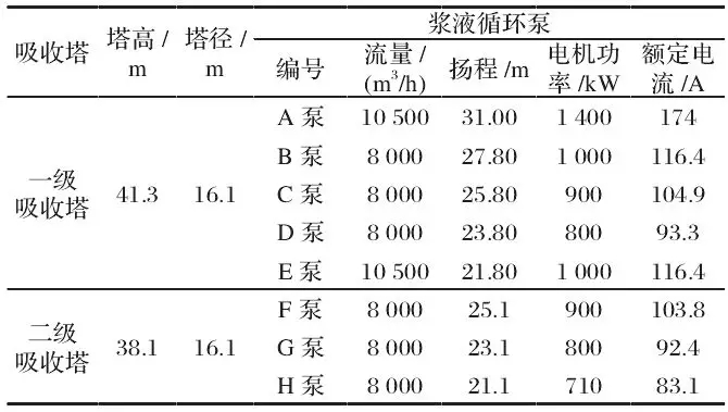 一、二級吸收塔塔型均是噴淋空塔,其配套的漿液循環泵的具體參數如表1所示。其中,一級塔5臺循環泵,二級塔為5臺循環泵。一級塔供漿分別在C泵和D泵上,二級塔供漿為吸收塔液位以上供漿。